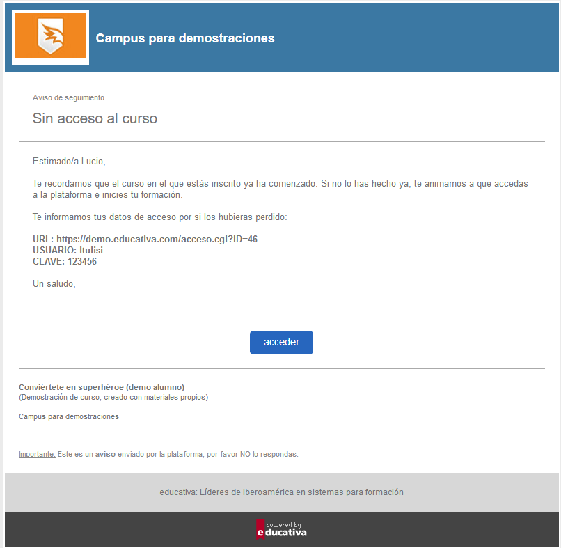 - invitación de ingreso al curso: una vez comenzado el curso, se puede generar un aviso de seguimiento dirigido a quienes no hubieran accedido pasados N días de habilitada el aula