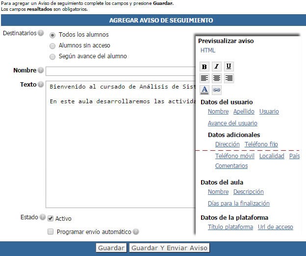 Los avisos de seguimiento surgen ante la necesidad de mantener un contacto permanente con los usuarios cursantes optimizando la labor del educador. Se desarrolla para permitir el envío planificado y automático de comunicaciones personalizadas por email en distintas situaciones del cursado (inicio de clases, agregado de contenidos, recordatorios de entregas o avisos en caso de demorarse en avanzar, por ejemplo). La potencialidad de esta herramienta radica en dos opciones:
