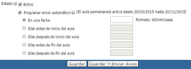 - recordatorio de inicio del curso: en caso de definir una fecha de apertura automática del aula, es posible generar un aviso de seguimiento automático para que se envíe N días antes del comienzo