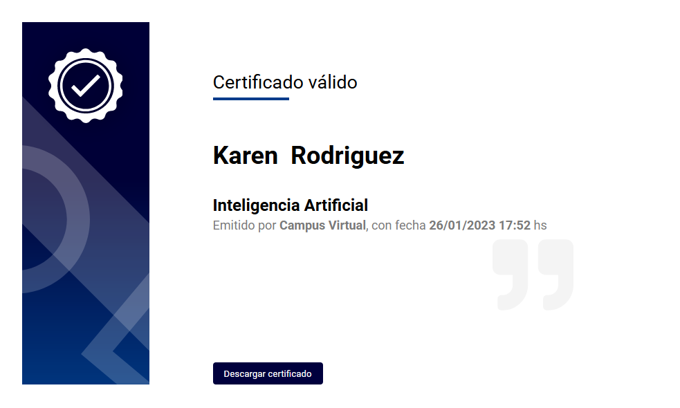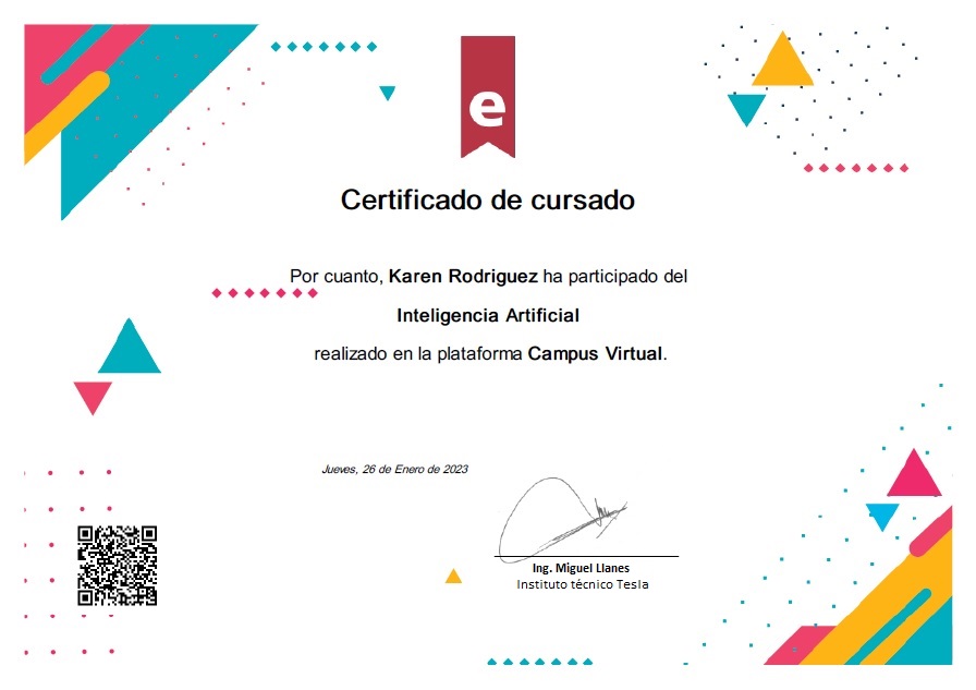 La alumna Karen Rodriguez culminó el 100% del curso online “Inteligencia Artificial” en el “Instituto técnico Tesla” que dicta sus formaciones virtuales en una Plataforma Educativa. Karen recibe su certificado digital con el código QR y se lo descarga, ya que debe presentarlo junto a su CV para enviar a la vacante laboral de una empresa de Sistemas: