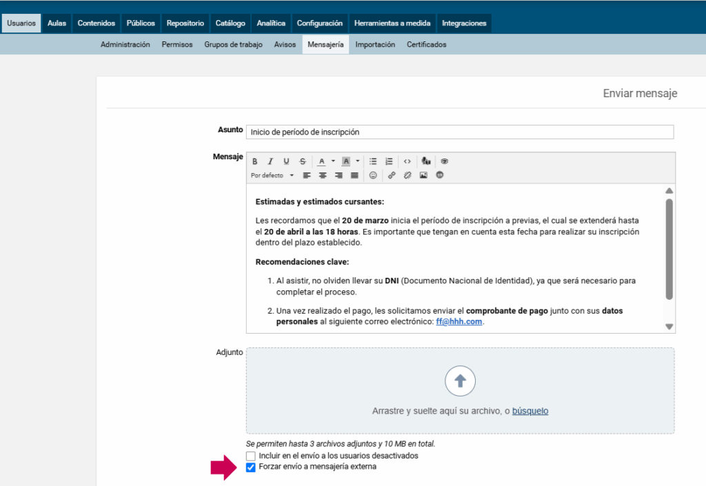 - Si activas la casilla “Forzar envío a mensajería externa”, el mensaje llegará también a la casilla de correo personal de cada destinatario. Úsala solo para información relevante que afecte a todos.