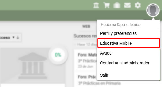 1– Desde la PC/Notebook en donde se está trabajando/cursando, en la esquina superior derecha, clic en la foto de perfil y luego clic en Educativa Mobile. Aparecerá una ventana en donde se le pedirá la contraseña de su usuario y luego se mostrará una imagen del código QR correspondiente a esa pantalla. Dejar esa pestaña del navegador abierta y desde el móvil abrir la APP Educativa Mobile.