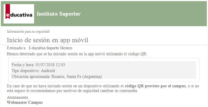 - Cada vez que se inicie una sesión mediante Código QR, se enviará un mail a la cuenta de correo asociada al usuario con el cual se está logueado, con el objetivo de notificar esta actividad.