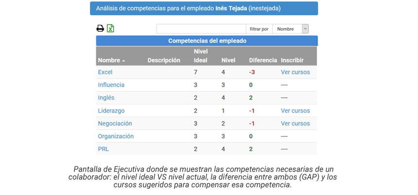 La plataforma web Ejecutiva permite sistematizar la definición de competencias, la asignación de éstas a los puestos perfiles, la evaluación y el cálculo automático de los GAPs, dispone además un sistema para gestionar todo el plan de formación que surge a partir del análisis individual y personalizado de todos los colaboradores de la organización.