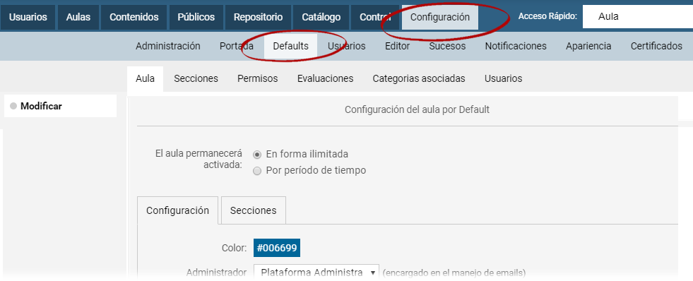 Para resolver esta situación recomendamos utilizar el menú “Defaults” ubicado en la Administración del Campus Virtual educativa, en el menú de “Configuración”. Desde allí podremos configurar las características que tendrán las aulas que se darán de alta de ahora en adelante.