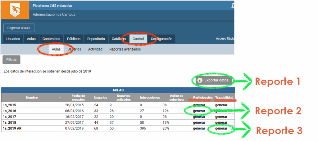 Dentro de esta categoría, seleccionamos sólo tres reportes que brindan información sobre la actividad global del campus, a nivel Aulas.